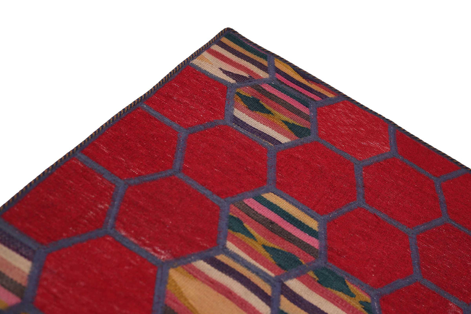 In this patchwork kilim, the materials used are wool, goat hair, and cotton. The weaving originates from Turkmen and Ardabil regions. The red coloration is distinctly Turkmen, while the patterned areas are from Ardabil. The design features a honeycomb pattern. Unlike many other kilims, this piece is lighter and coarser, a characteristic attributed to the use of goat hair. Additionally, it has been dyed entirely with natural plant-based dyes, ensuring colorfastness.